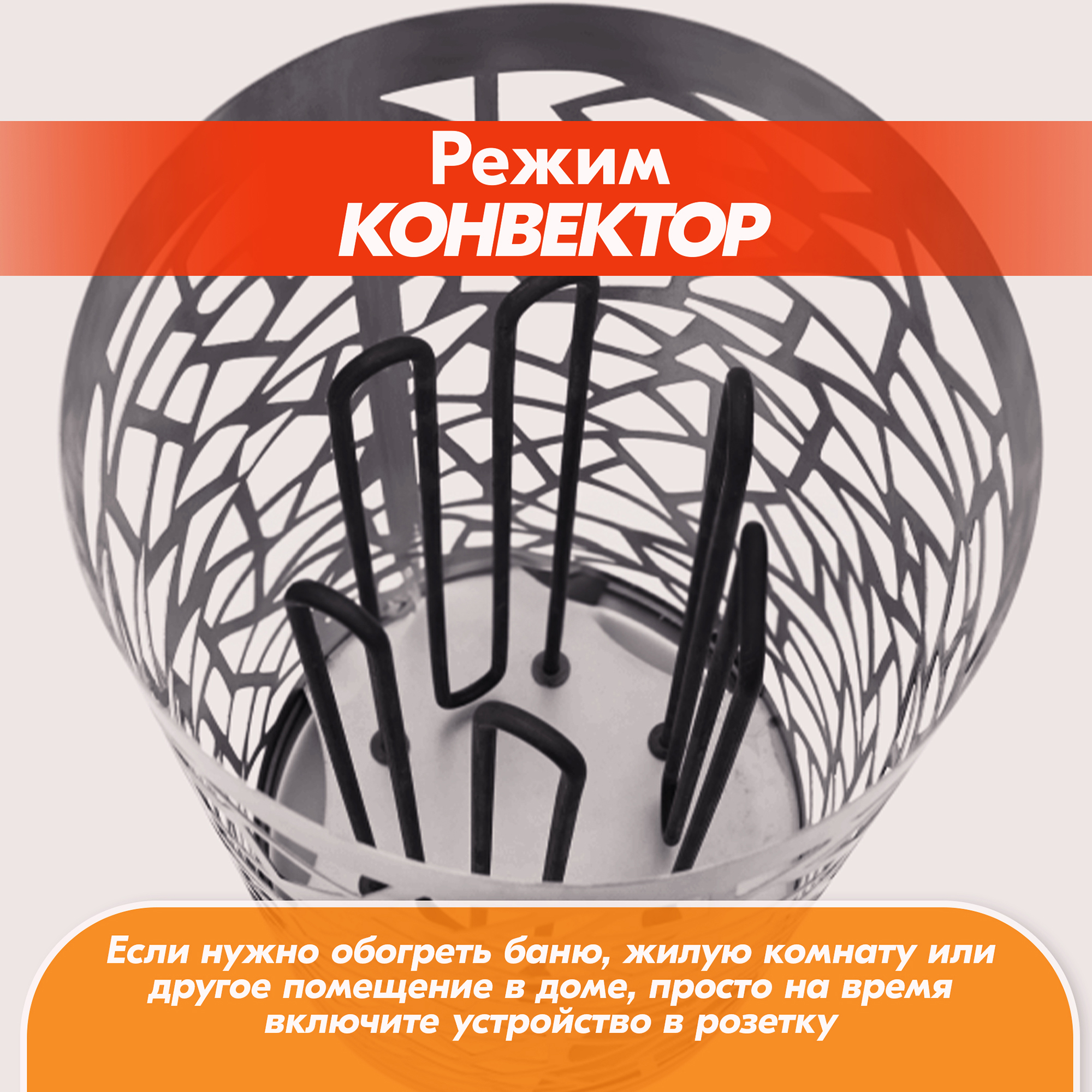 Внутренние ТЭНы прогревают банные камни, тепло от которых поступает в парную.