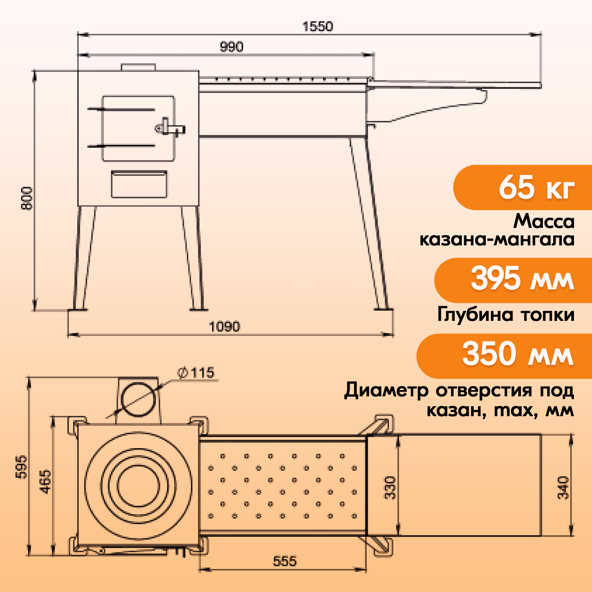 Печь для казана имеет емкую топочную камеру с колосниковой решеткой и глубиной 400 мм.