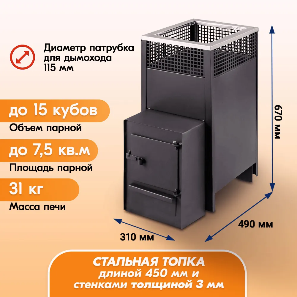 Дровяная банная печь Радуга ПБ-10 мощностью 10 кВт подходит для малых парных объемом до 15 кубов (или до 7,5 кв. м при высоте потолка 2 м).