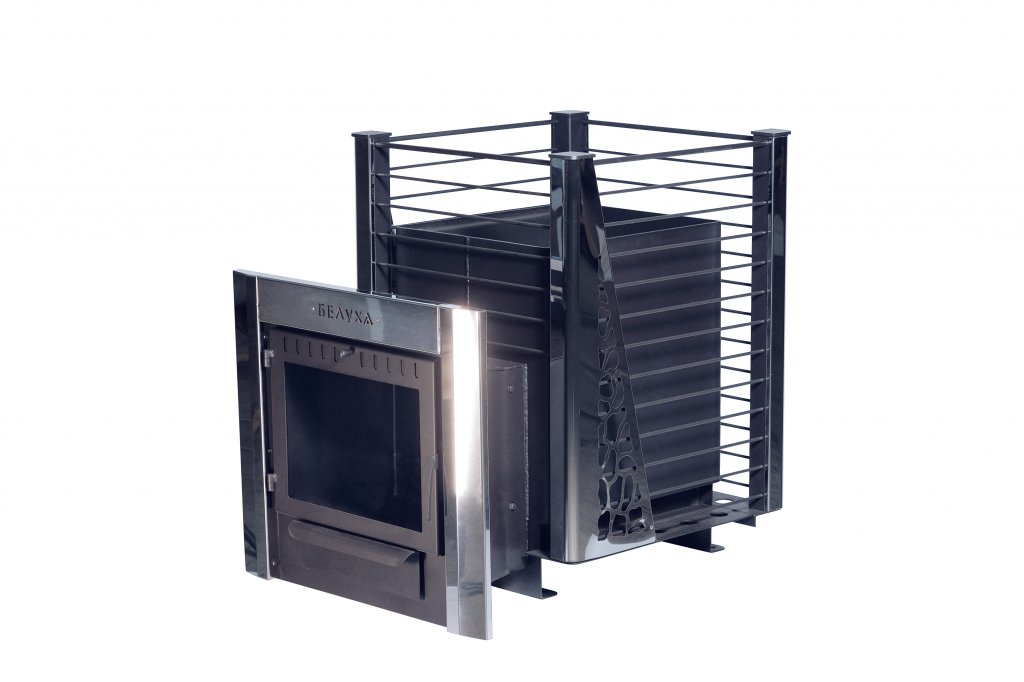 Печь "Белуха" оснащена выносным топливным каналом и панорамным термостойким стеклом, позволяющим наблюдать за процессом горения и топить печь из смежного помещения.