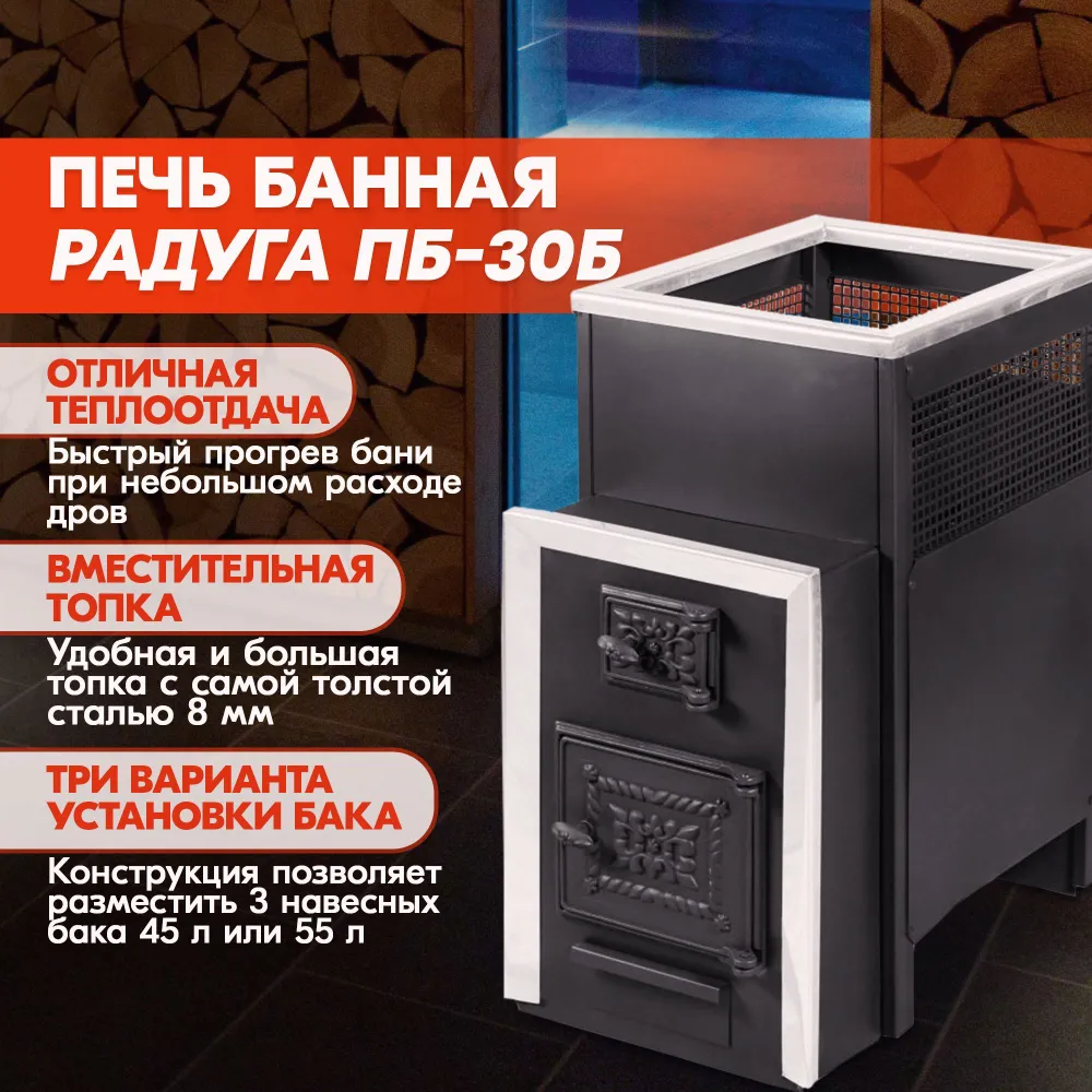 Печь банная Радуга ПБ-30Б дровяная имеет удобную конструкцию и очень вместительное отделение для топки, обеспечивает быстрый и равномерный нагрев бани.