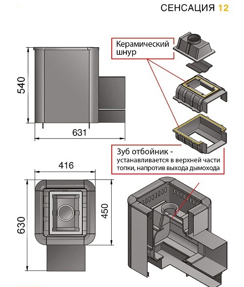 Топка чугунной печи «Сенсация» состоит из трёх элементов, толщиной не менее 12 мм. На стыке между ними используется керамический шнур с рабочей температурой 1200 градусов. То есть топка печи абсолютно герметична! Для фиксации деталей между собой применяется болтовое соединение, что даёт 100% гарантию безопасности при эксплуатации. Печи отлиты из специального сплава чугуна, которые выдерживают максимальные температурные перепады, т.е. даже при попадании большого количества воды чугунная печь сохраняет свою исключительную целостность и не лопается в отличие от изделий других производителей.