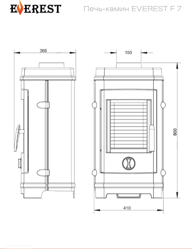 Быстрый разгон температуры воздуха до комфортной, поддержание тепла в комнате в течение нескольких часов, большая дверка, малый вес, компактность и интересная форма отличают печь-камин из европейского чугуна EVEREST F7.