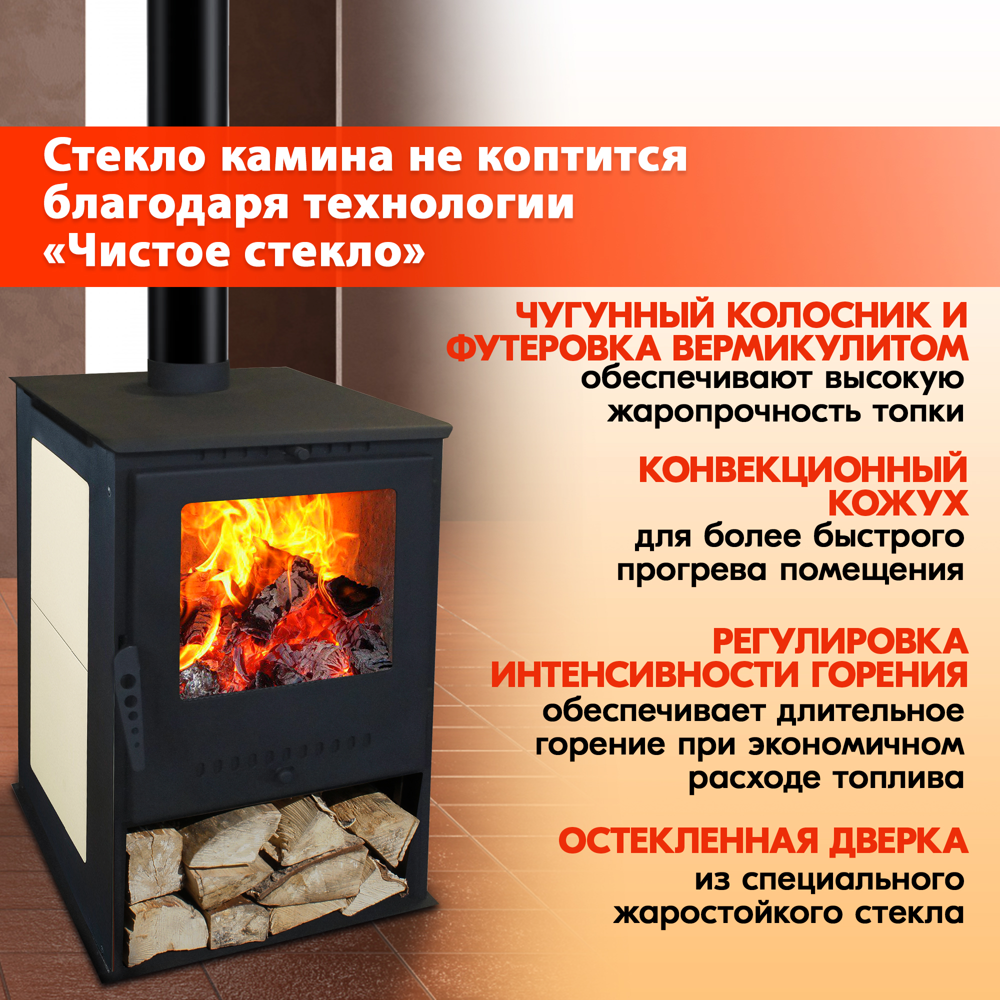 Конвекторы создают конвекционную тягу, что ускоряет нагрев помещения и снижает тепловую нагрузку на стенки топки, тем самым охлаждая ее.