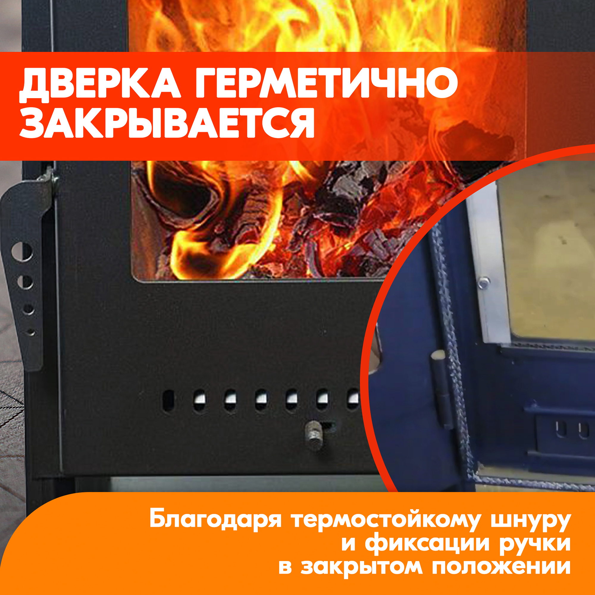 По периметру дверки проложен термостойкий шнур для плотного прилегания.