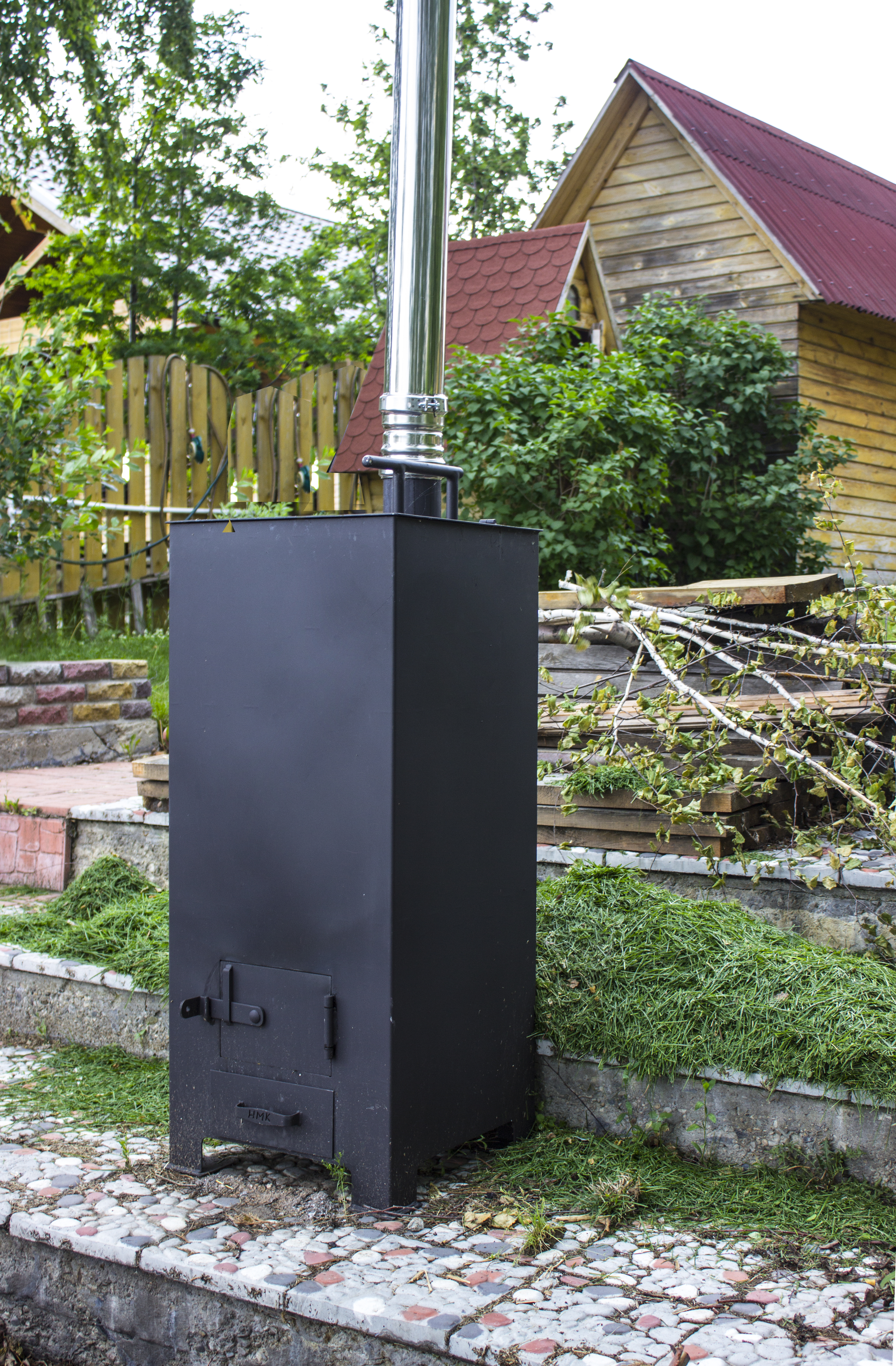 Печь изготовлена из стали марки СТ3СП5, окрашена двумя слоями термостойкой краски, что делает ее пребывание на приусадебном участке максимально гармоничным. Толщина стенок печи составляет 3 мм, что делает использование данной печи долговечным и надежным.